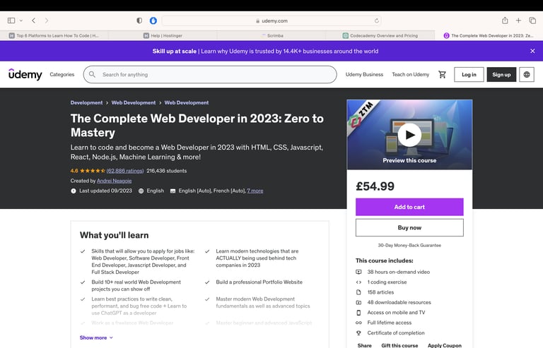 Price: Free Plan (limited courses available), Plus Plan (£23.00/month or £143.88/year), Pro Plan (£31.99/month or £191.88 / year - good for those who want career support and professional certifications)