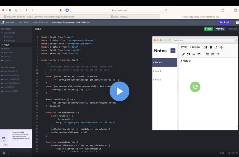 Course delivery: Scrimba has the most unique code learning experience I have had. It is video-based with an interactive coding platform however, you can edit your instructor's code in live time. I honestly love this learning model and feel that it kept me engaged. I thoroughly enjoyed seeing the instructor type out solutions to coding problems in real-time and verbalise their thinking. This is such an important aspect of programming that you don't get from text-based learning. You can test your knowledge through the projects.